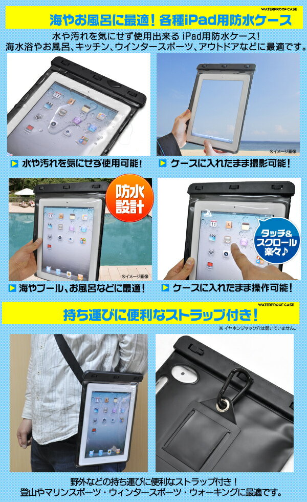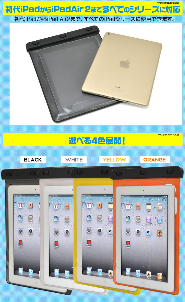 (メール便不可)■防水加工の各種iPad用ケース! 海水浴やお風呂に便利な、各種iPad用防水カラーケース! ■すべてのiPadに使用可能!初代iPadからiPad2、新しいiPad、iPad Retina、iPad Air、iPad Air2まで、すべてのiPadシリーズで使用できます。